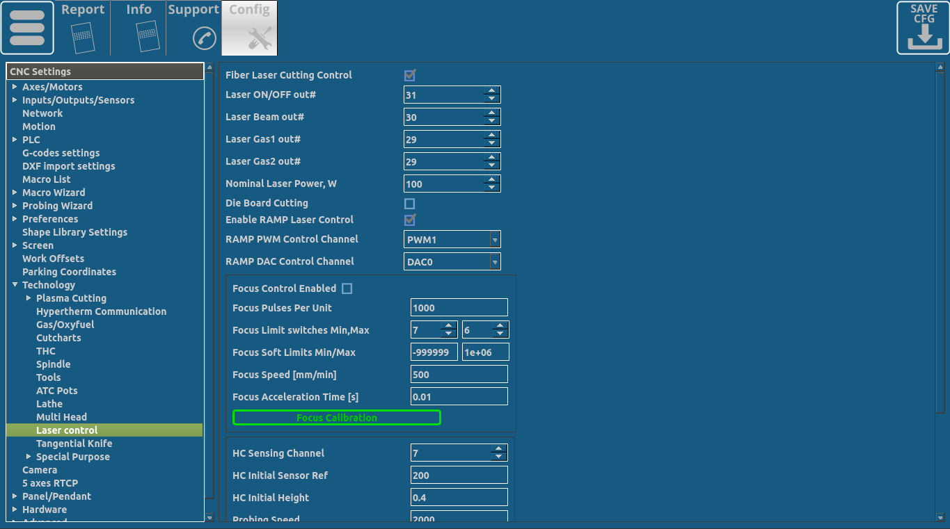 - Focus limit switches for the MIN/MAX limit - номера входов для лимитов фокуса лазера