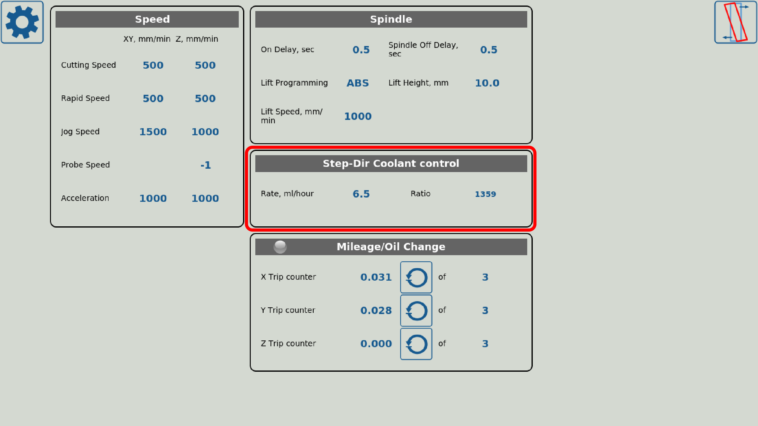 The rate, ratio and acceleration can be set up in the Software PLC, as well as in the User Settings widget (the Step-Dir Coolant Control section).
