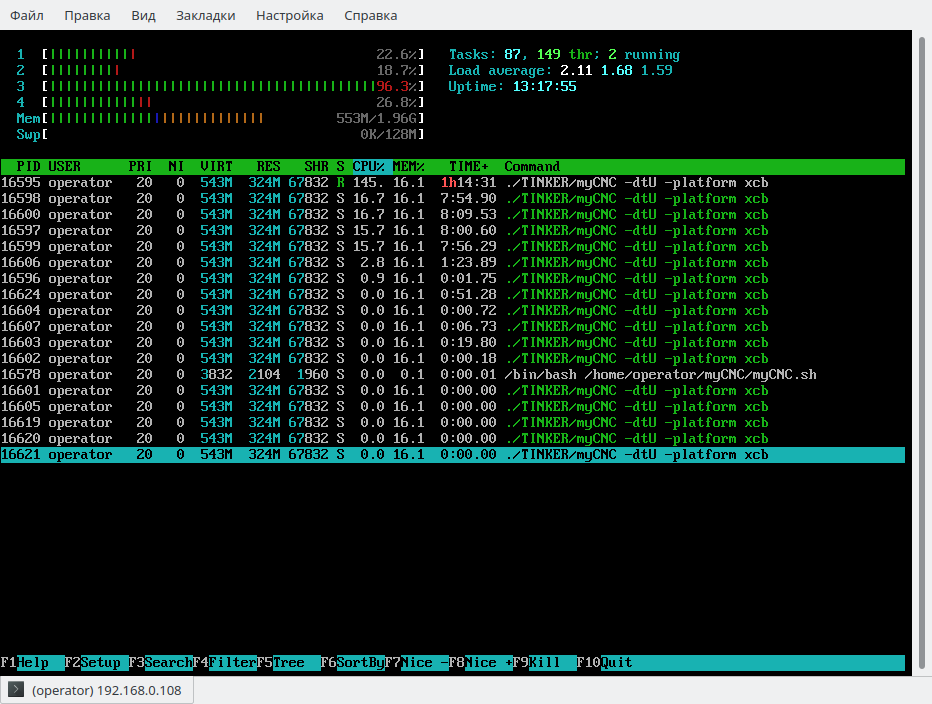 Процессор одноплатного компьютера сильно загружен при выполнении данного кода. Утилита Htop показывает загрузку одного ядра на 145% и остальных ядер около 16% каждое.
