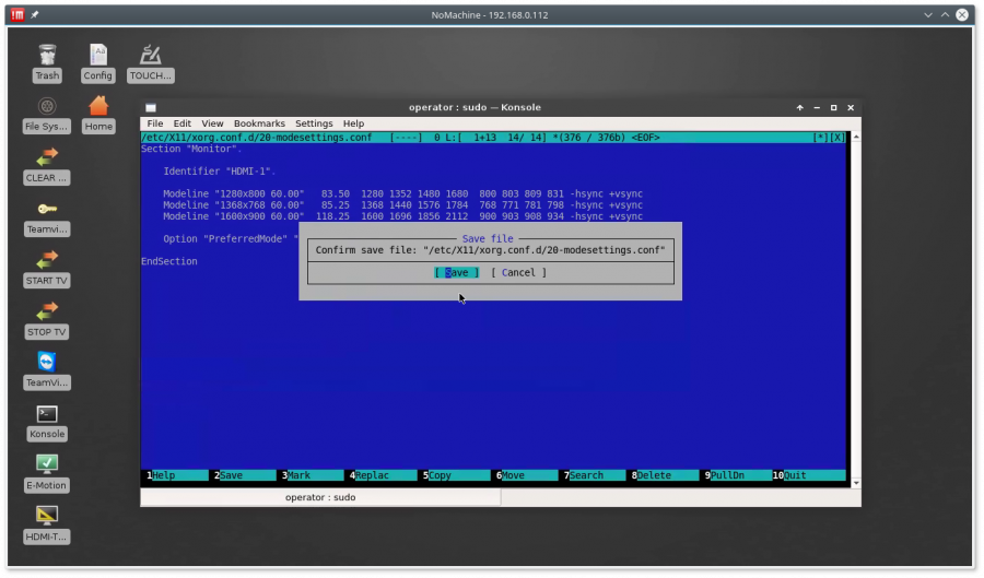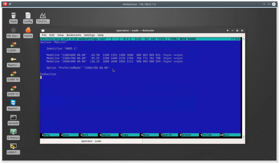 4. Add modesettings for 1368×768 resolution into “Monitor” Section. There can be several Modeline lines for different screen resolution you like to add. Add “PreferredMode” Option for resolution you like to have by default. Press “F2” button to save the changes.