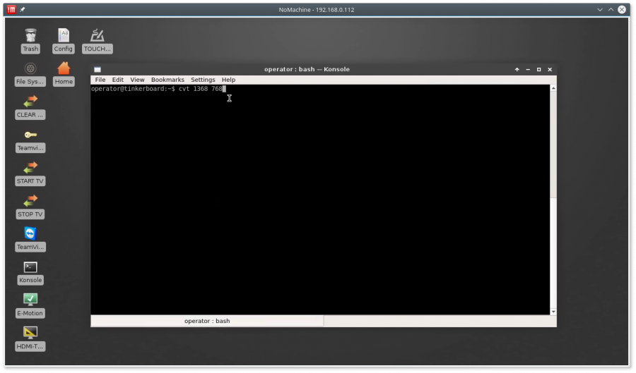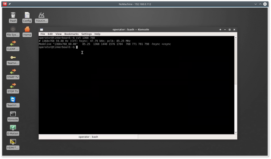 operator@tinkerboard:~$ cvt 1368 768 # 1368x768 59.88 Hz (CVT) hsync: 47.79 kHz; pclk: 85.25 MHz Modeline "1368x768_60.00" 85.25 1368 1440 1576 1784 768 771 781 798 -hsync +vsync operator@tinkerboard:~$
