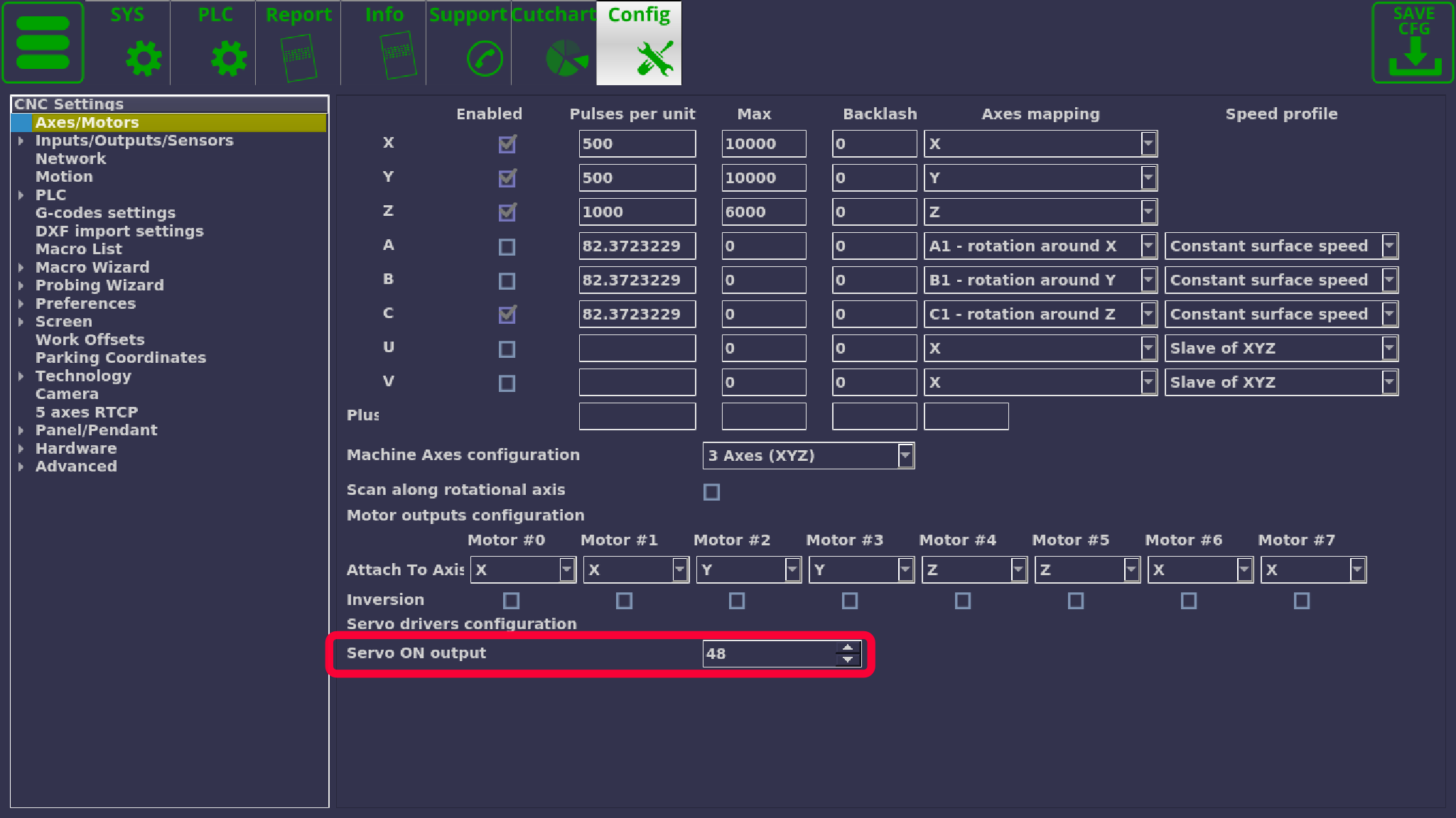 Выход Servo ON для включения/выключения сервопривода должен быть выставлен в секции Settings > Config > Axes/Motors: