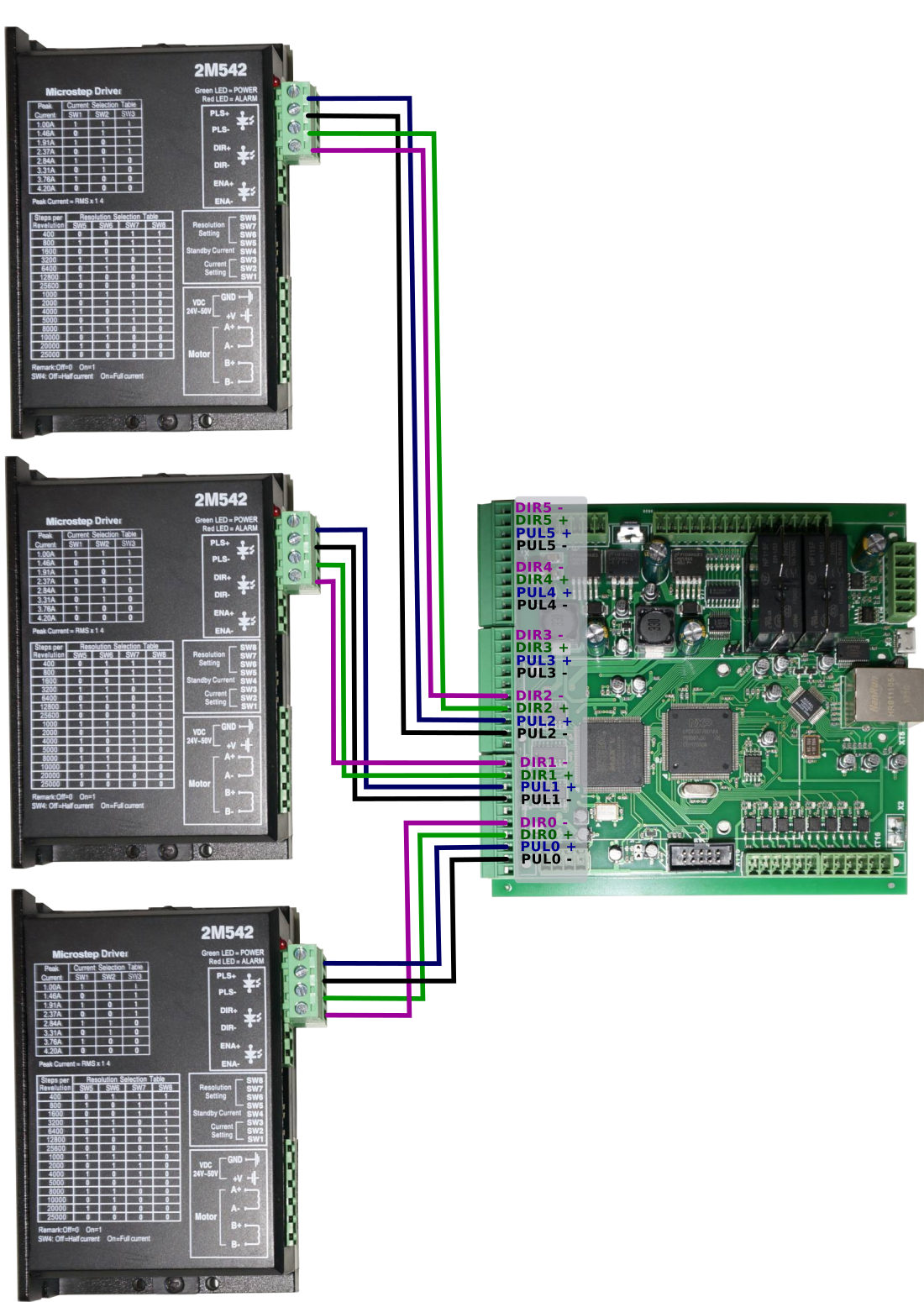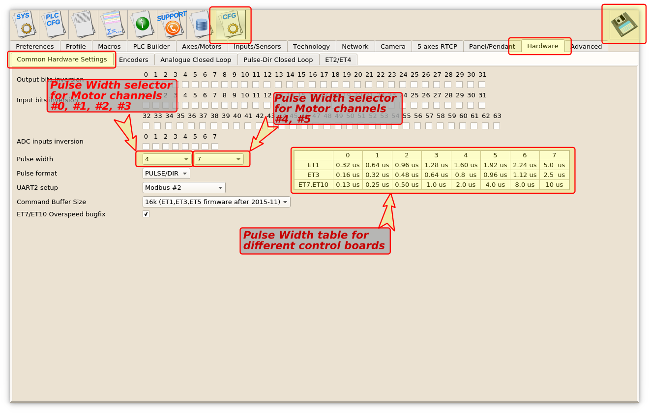 - Контроллеры MyCNC-ET6, myCNC-ET7 поддерживают отдельные настройки ширины импульса для первых четырех каналов (# 0, # 1, # 2, # 3) и остальных двух каналов (# 4, # 5). Эта опция может быть удобной, если использовать высокопроизводительные сервопривода с шаговыми приводами с низкой частотой вращения (например, высокоскоростные сервопривода для осей X, Y, Z и низкоскоростной шаговый драйвер для оси вращения A). Контроллер myCNC-ET10 использует только первый селектор ширины импульса для всех выходов двигателя.