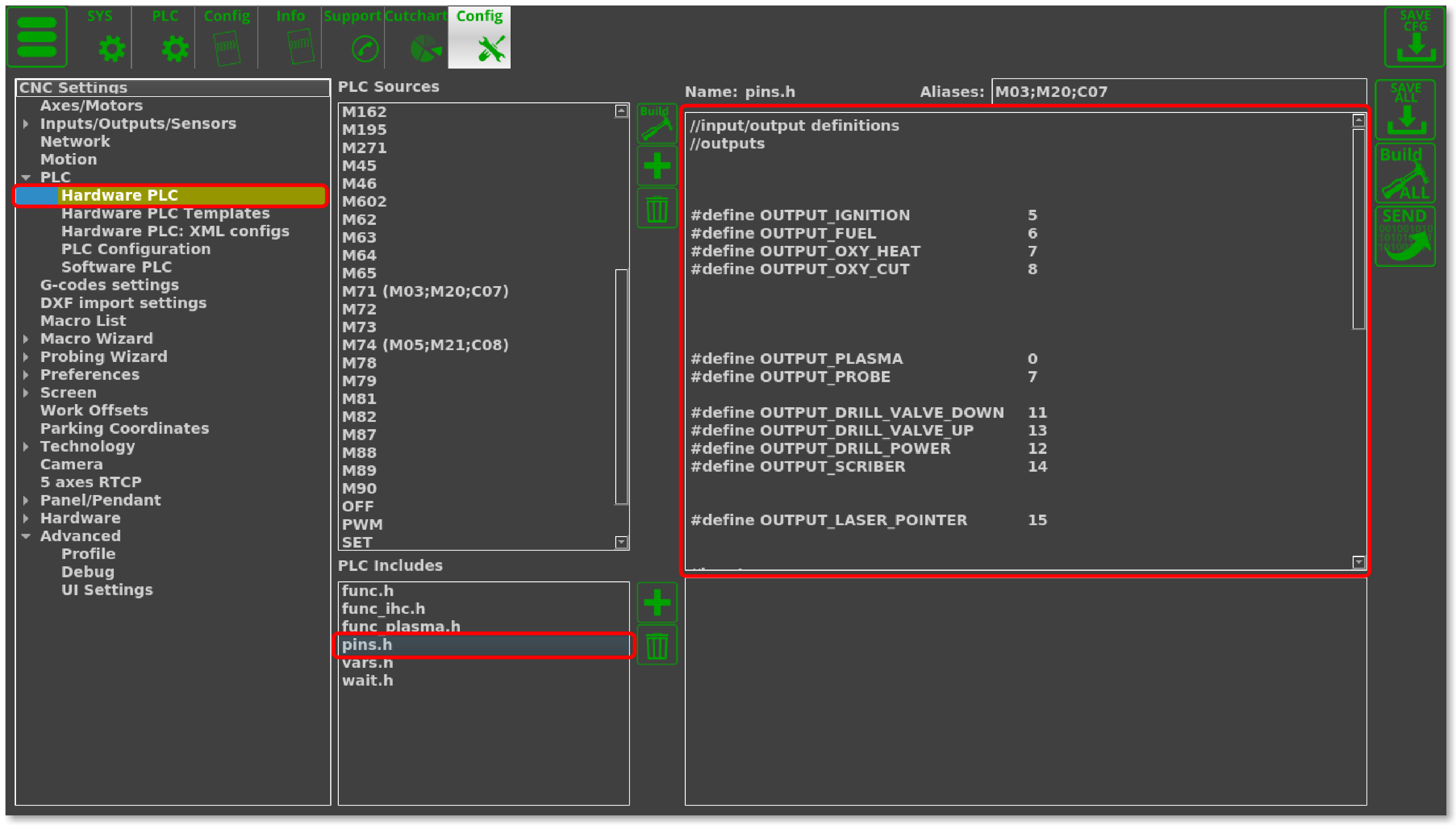 Такие команды, как M03 (включить шпиндель) и M71 (включить плазменный резак) записываются с учетом некоторых указанных номеров входов и выходов - когда сигнал отправляется на этот конкретный выход или когда состояние входа изменяется, происходит какое-то действие (в зависимости от ситуации). Однако конкретные номера для этих входов и выходов не указываются в конкретных процедурах PLC - вместо этого есть отсылка на имя присвоенное в программе этому входу или выходу (например, изменение выхода, который определен как OUT_SPINDLE, изменит состояние шпинделя с OFF на ON). Это сделано для того, чтобы не было нужно проверять все соответствующие PLC процедуры, когда необходимо изменить номер входа/выхода. Вместо этого эти эти данные определяются в файле pins.h
