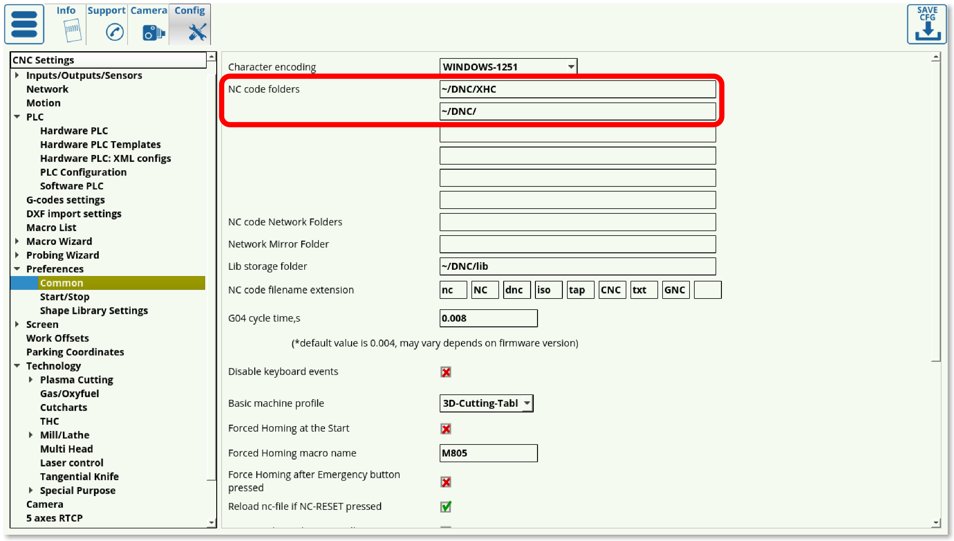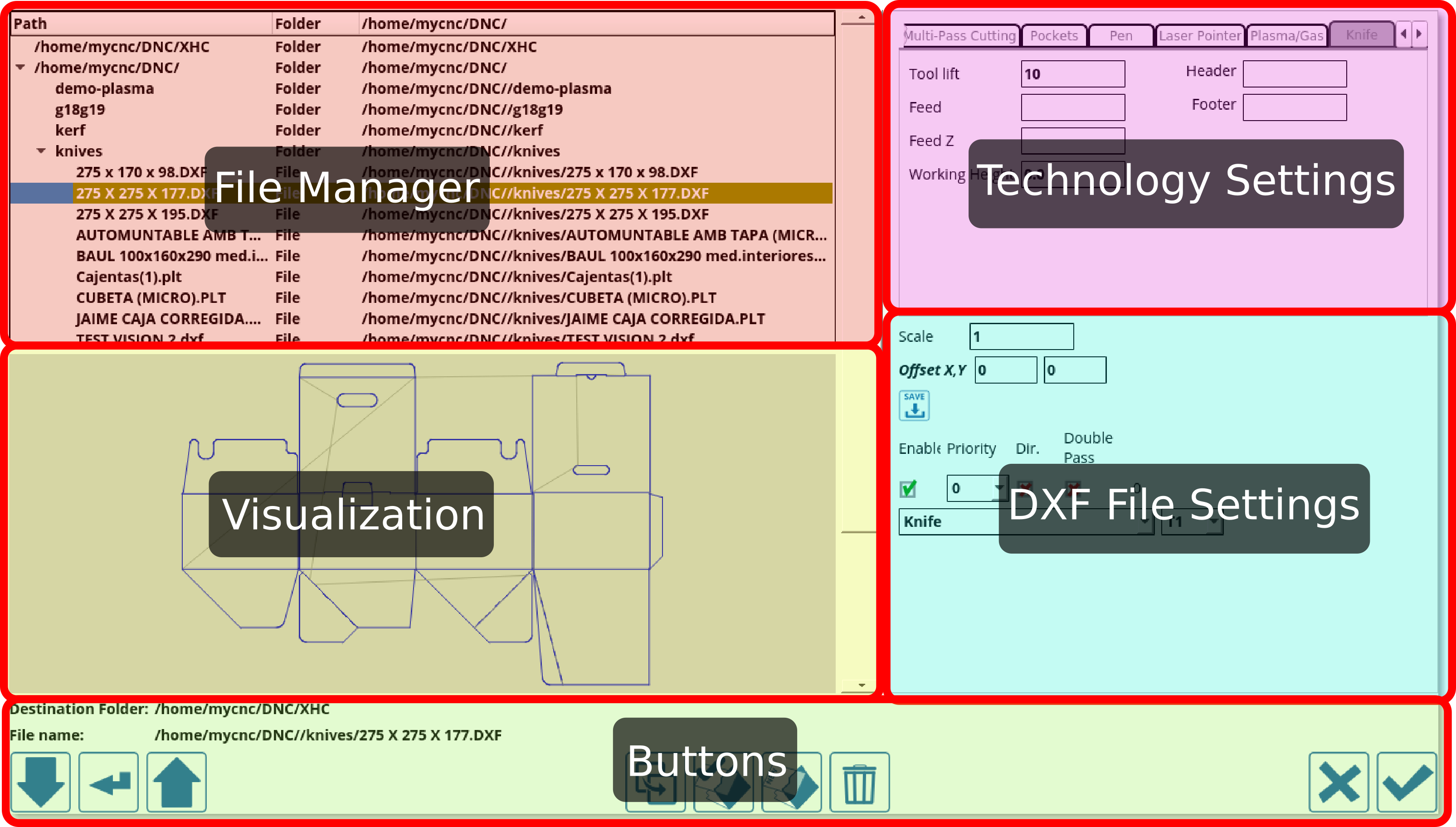 Менеджер файлов позволяет пользователю выбрать конкретный файл DXF, который он хотел бы открыть. Обратите внимание, что папки, доступные пользователю с помощью функции импорта DXF в программном обеспечении myCNC, перечислены в Settings > Config > Preferences > Common. При импорте доступны только перечисленные в этом окне папки.