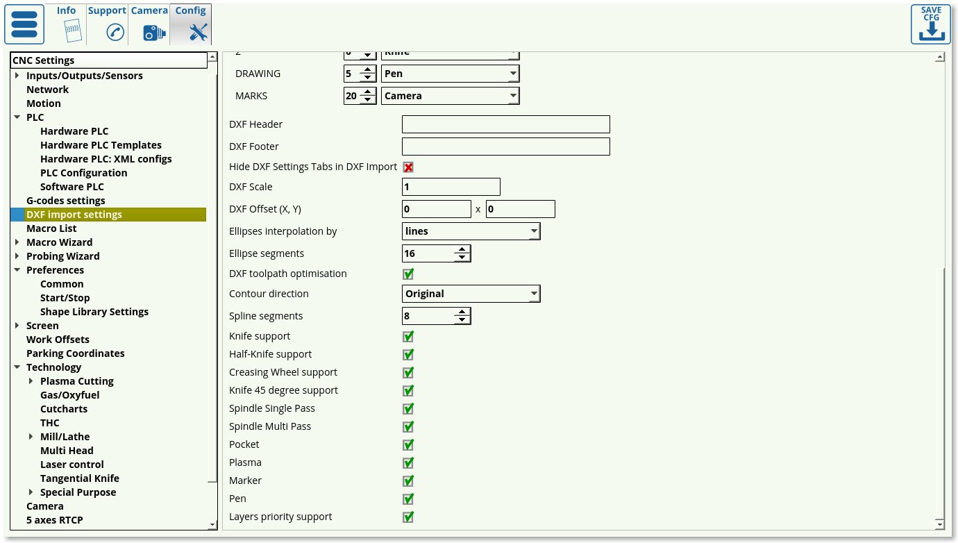 Настройки этих технологий также доступны в Settings > Config > DXF import settings. В зависимости от конкретной машины, ненужные технологии могут быть отключены для большей простоты экрана импорта.