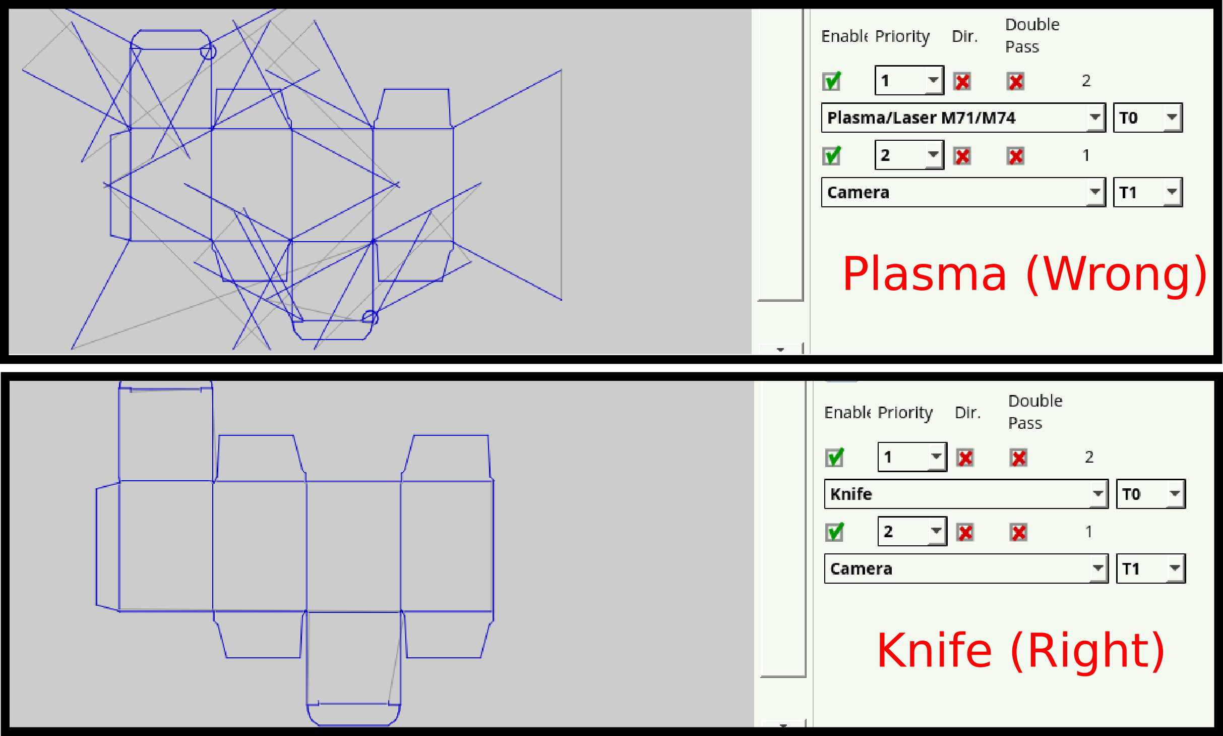 В качестве примера ниже приведена визуализация файла DXF, созданного с учетом тангенциального ножа. Если инструмент был неправильно выбран (здесь используется плазменный резак), визуализация может послужить полезным напоминанием для пользователя: