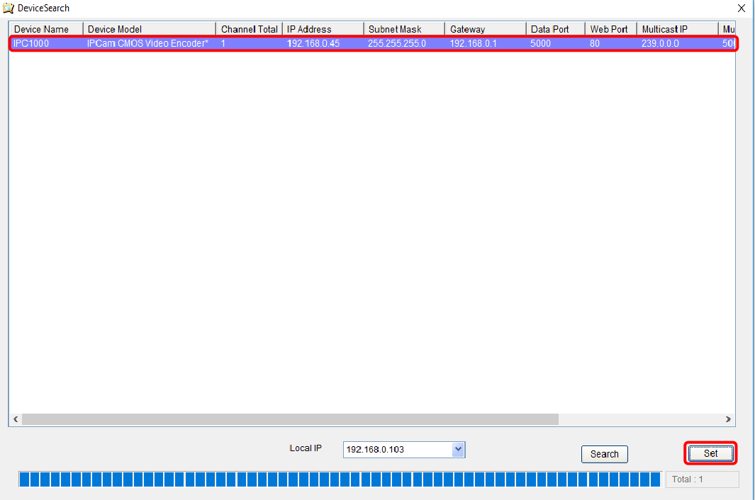 - After the camera you're looking for has appeared in the device list, select it and click 'Set'“