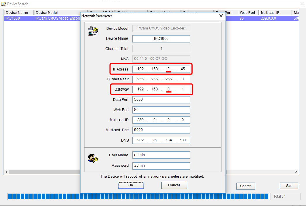 - The camera settings window will appear. In it, it is important to have the Camera IP and Gateway to the same subnet as the Local IP address from earlier (note the