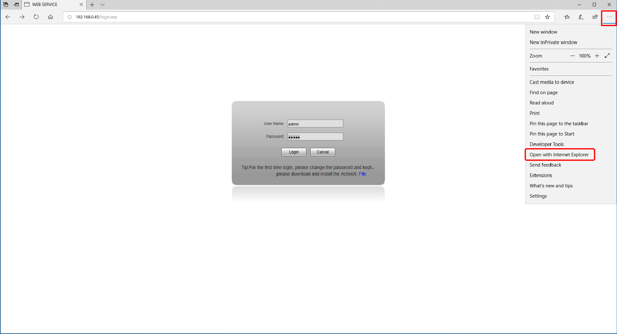 - The utility application for the provided cameras works only in Internet Explorer 9 and below. If using Microsoft Edge, go the menu and select the Open with Internet Explorer option: