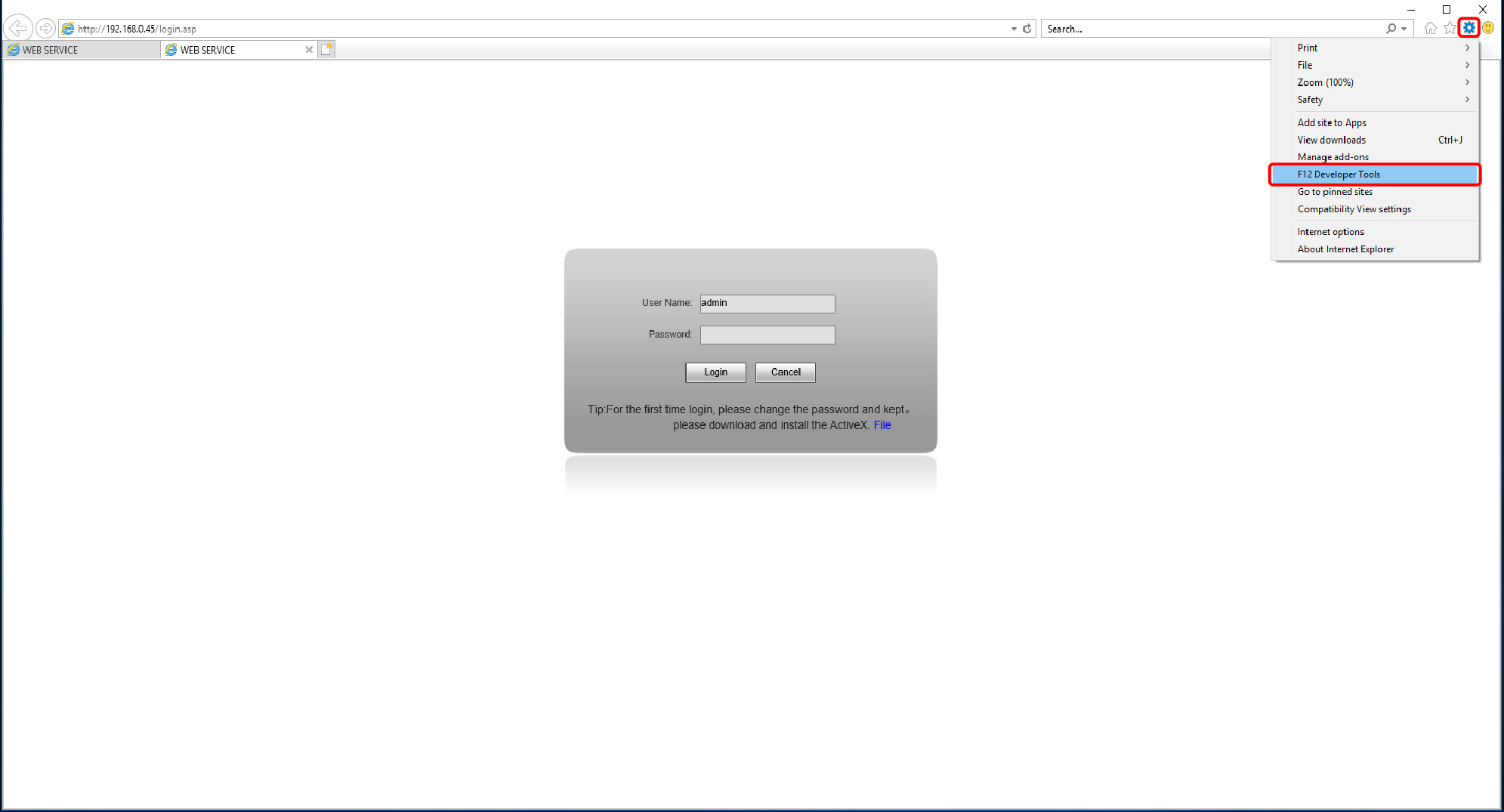 - Once in Internet Explorer, it is necessary to use the Internet Explorer 9 (or below) version. In order to do that, if the browser version you are using is more recent than IE9, open the menu and select the F12 Developer Tools option: