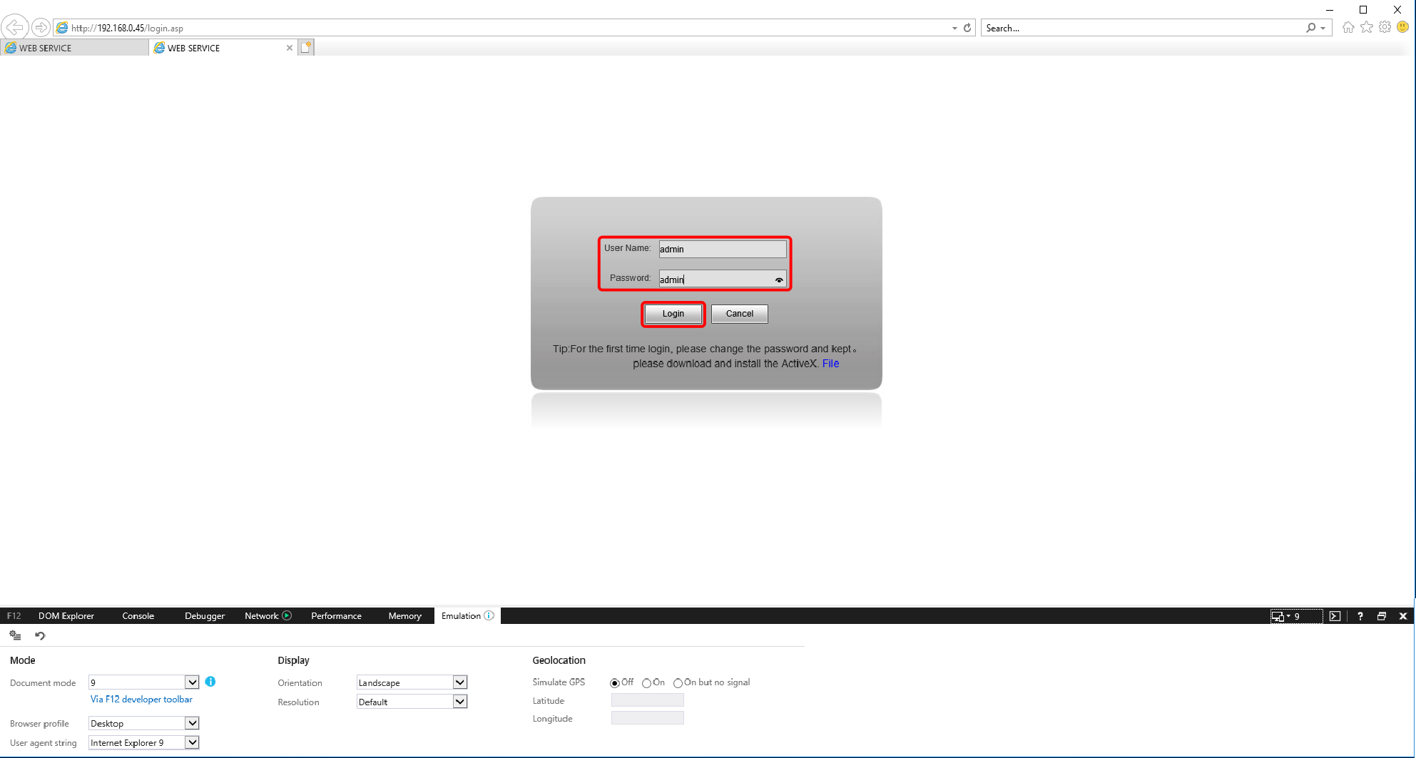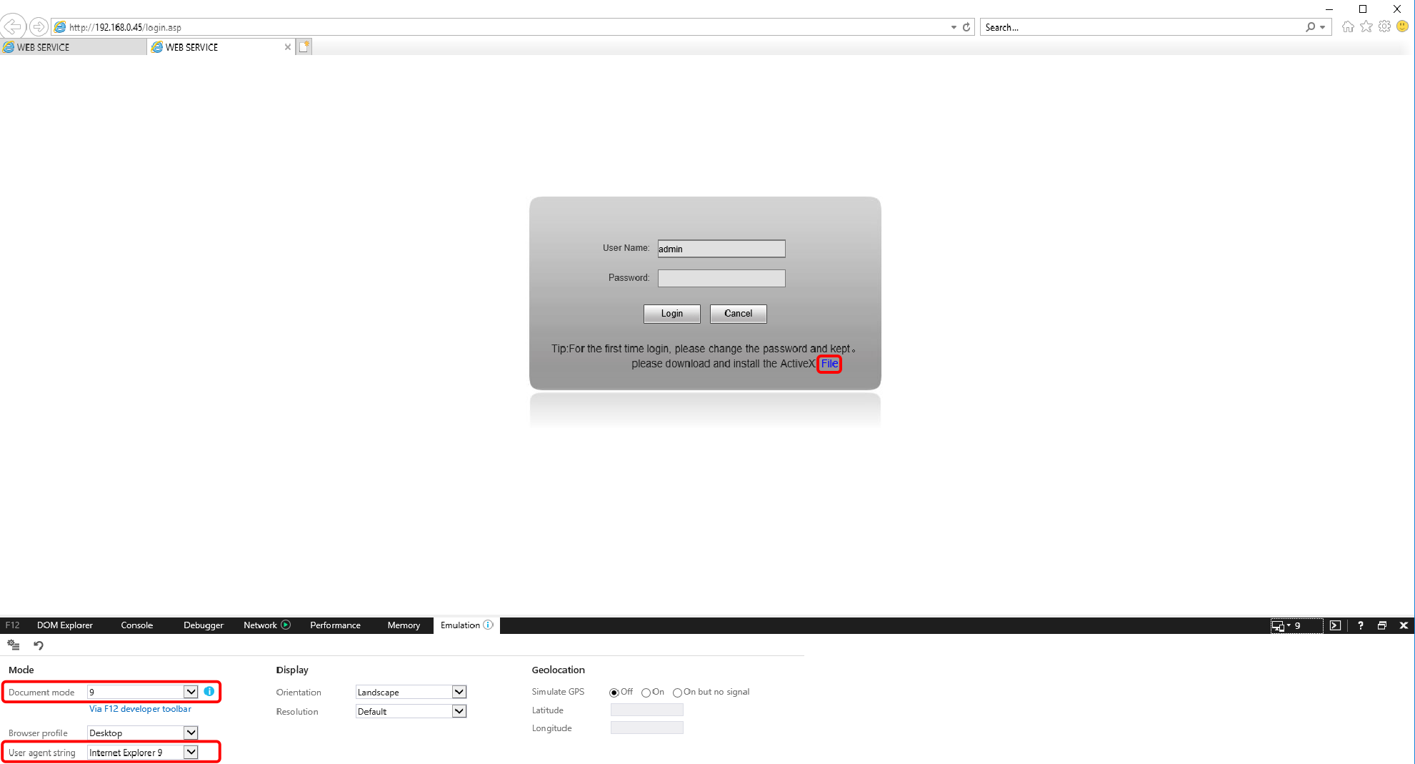 - In the Developer Tools at the bottom of your screen, navigate to the Emulation tab and choose 9 for Document Mode and Internet Explorer 9 for User agent string. After that has been selected, click the File link in the log in window: