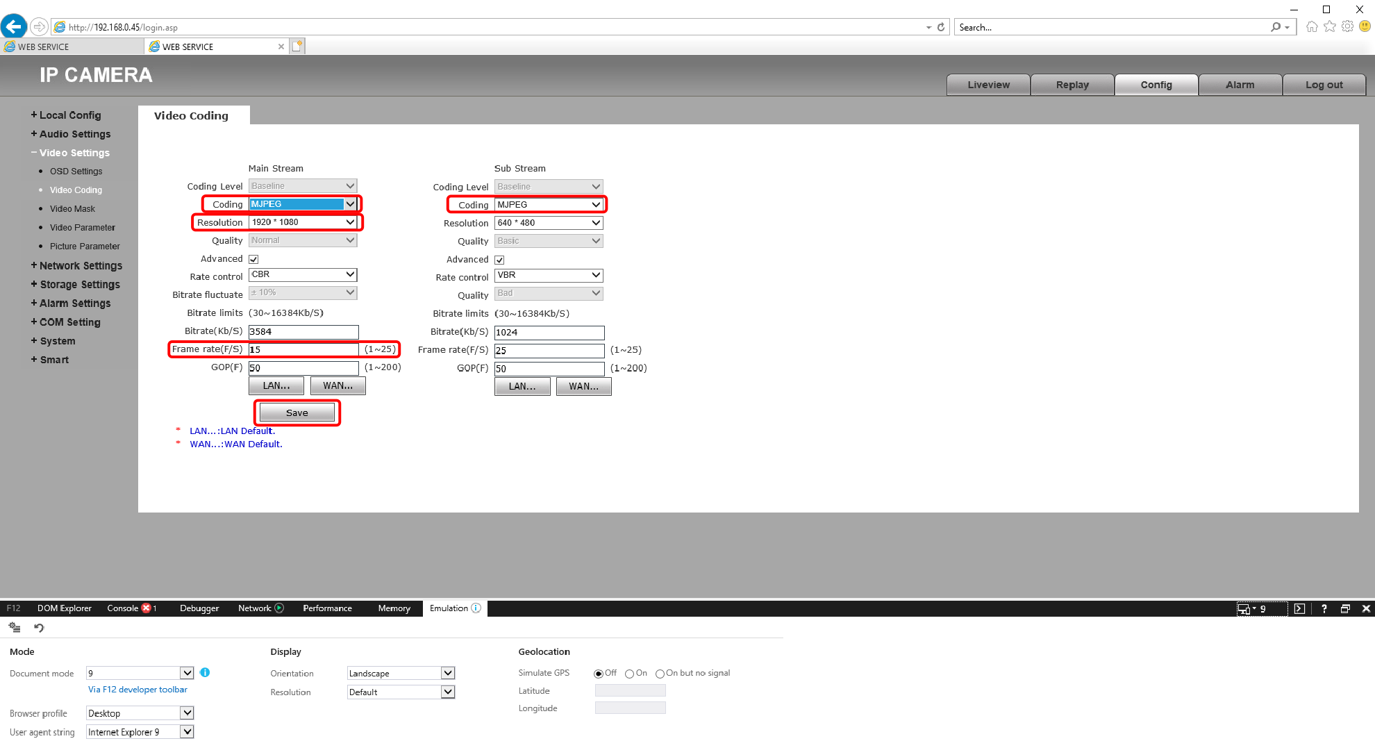 - In the Video Coding window, check that the Coding field is set to MJPEG for best image recognition results when using the myCNC Vision System. Here you can also change the resolution and the frame rate of the camera. Typically, a frame rate of around 10 frames/sec is sufficient for the myCNC Vision System. Click 'Save' once you've successfully altered the necessary settings:
